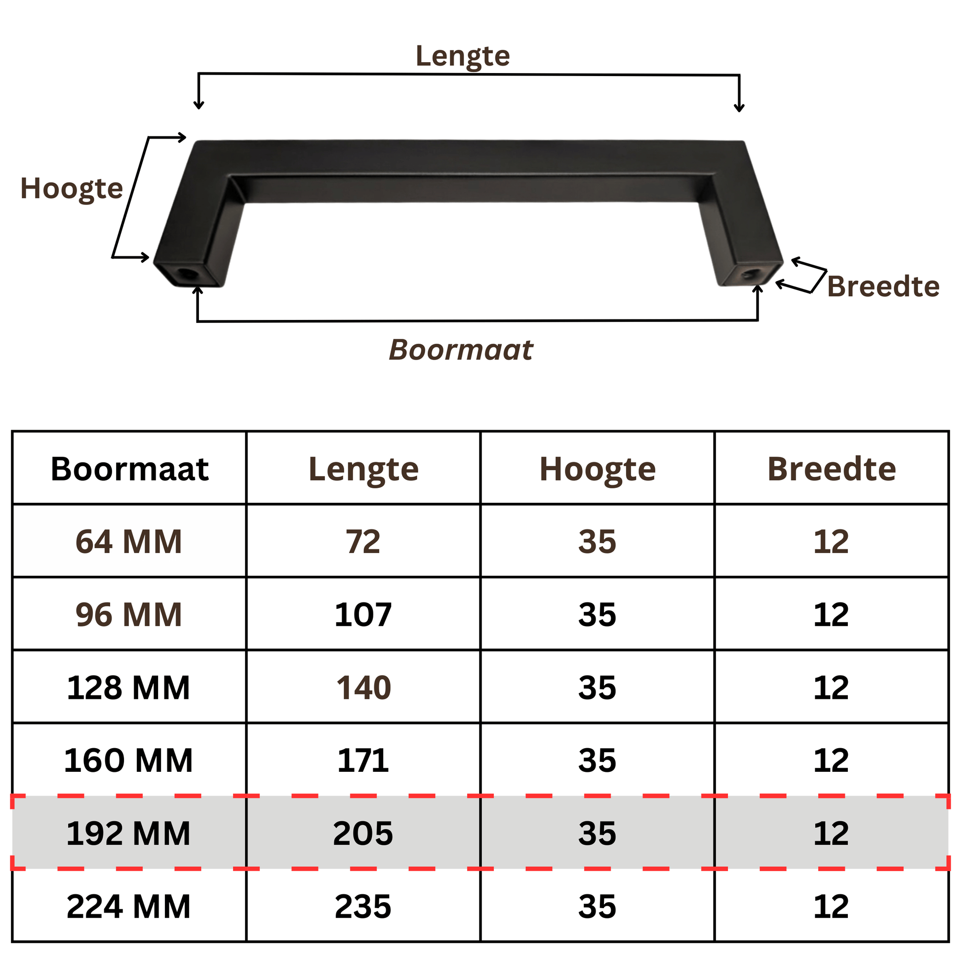 De boormaat is de afstand tussen de montagegaten. De totale lengte is de volledige buitenmaat van de greep. Voor bestaande gaten is de boormaat het belangrijkst.