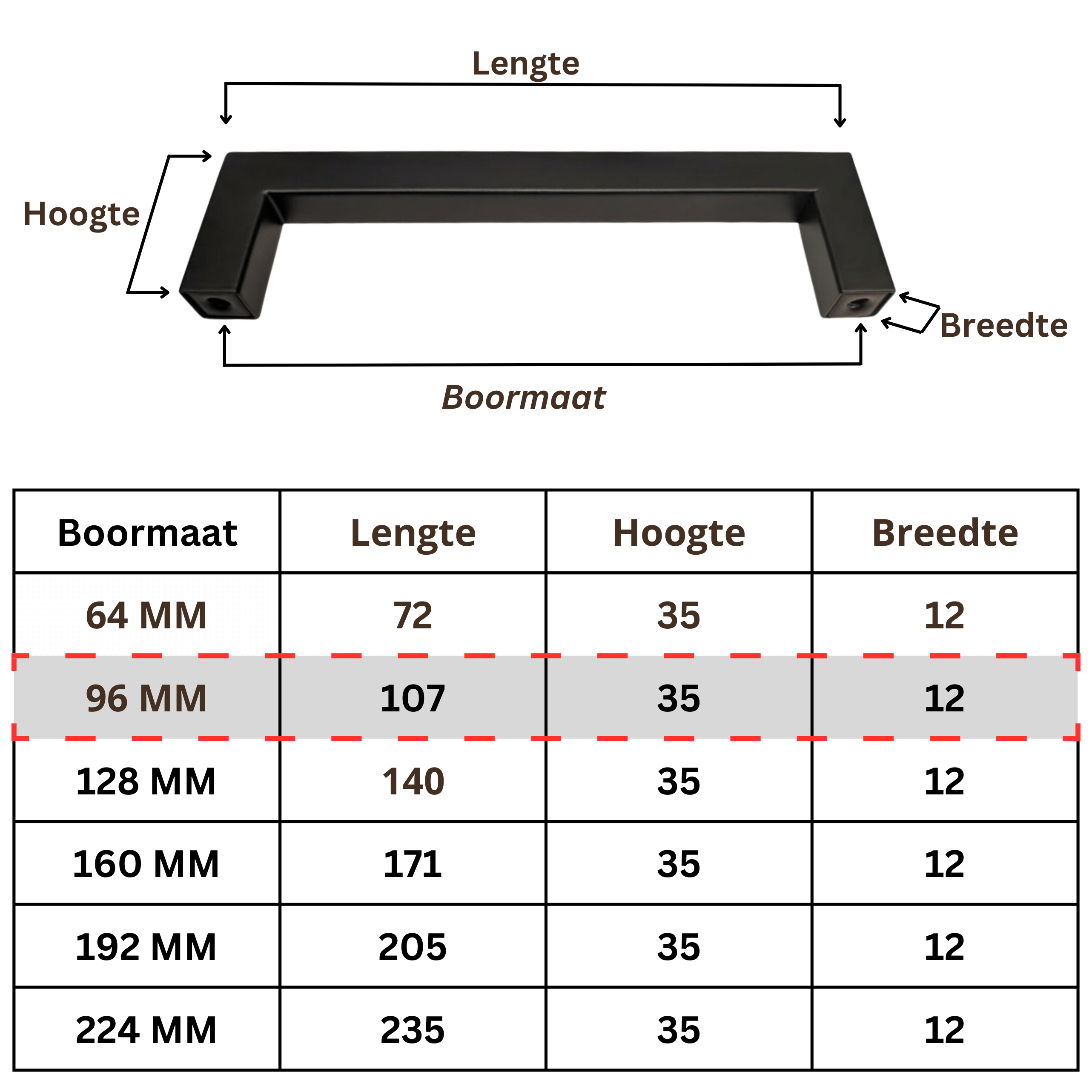 De boormaat is de afstand tussen de montagegaten. De totale lengte is de volledige buitenmaat van de greep. Voor bestaande gaten is de boormaat het belangrijkst.